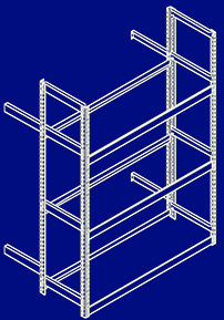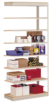 The first unit you’ll need is a starter, which is your basic shelving unit. It has one vertical angle post for each of the four corners and two front-to-back length angle beams and two left-to-right length angle or channel beams per shelf (the bottom level always has angle beams). If you are using bulk shelving units, you will also receive a front-to-back length center support for each shelving level. Every row of shelving you create will need one starter unit at the beginning.