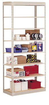The standard boltless shelving unit has vertical angle posts at each corner with keyhole slots every 1.5 inches. All horizontal beams run both front-to-back and left-to-right on the unit to hold up decking material (usually particle board, steel, or wire), creating a shelf. The horizontal beams at the top and bottom of the unit are double rivet angle beams, attaching at two points of each post, while the intermediate shelves use L-shaped single rivet angle beams that attach to the posts at one point on each side. The low profile of single-rivet beams allows for a maximum clear opening between shelves. Because these beams have a thinner width, however, they have a lower weight capacity, usually ranging from 250 to 350 pounds per shelf. As with all boltless shelving types, there are no crossbars on the sides, so you have access to your materials from all sides.