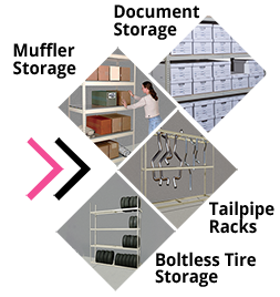 Heavy duty garage shelving for automotive is also a common specialty design. Muffler storage units allow for uniform storage for various sizes and shapes of mufflers and can bear significant amounts of weight, while boltless tailpipe racks are specifically designed with beams along the top from which to hang automotive and light truck tailpipes—no decking required. Boltless tire storage racks also have specially designed horizontal beams with 30-degree angle flanges that cradle standard automotive and light truck tires and keep them from rolling away. That way you can stack your tires without compromising on their organization and accessibility!