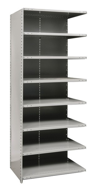 - Shelving: 8 shelves (including top and bottom) that can be installed with beaded front and back angle posts, T-posts and H-posts using 4 shelf clips each.