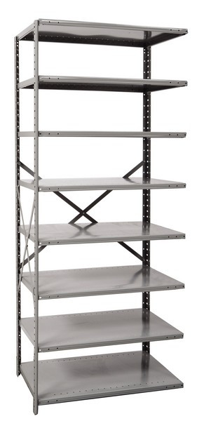 - Shelving: 8 shelves (including top and bottom) that can be installed with beaded front and back angle posts, T-posts and H-posts using 4 shelf clips each.