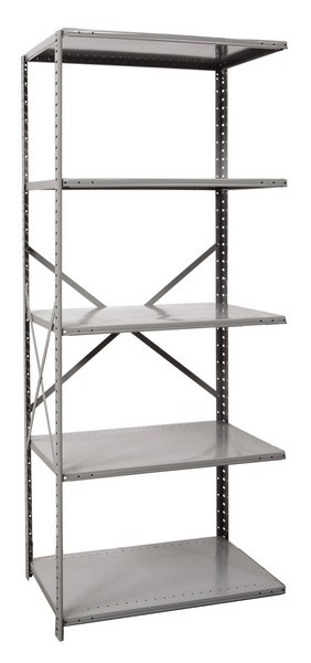 - Shelving: 5 shelves (including top and bottom) that are installed using 4 shelf clips each and can be installed with beaded front and back angle posts, T-posts and H-posts.
