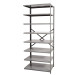 - Shelving: 8 shelves (including top and bottom) that can be installed with beaded front and back angle posts, T-posts and H-posts using 4 shelf clips each.