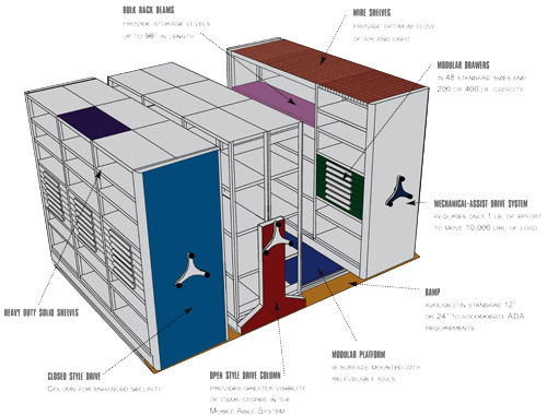 - Mobile Aisle systems are versatile: A mobile system eliminates walkway and aisle space, utilizing the full cube. They can be fitted with shelving, racks, modular drawers, cabinets - in essence, a wide variety of configurations and options that are available.